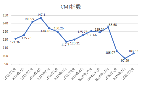 匠客工程機(jī)械數(shù)據(jù)顯示,2020年3月份中國工程機(jī)械市場(chǎng)指數(shù)即CMI為103.32,同比降低27.21%,環(huán)比提高6.20%(依據(jù)CMI判斷標(biāo)準(zhǔn),CMI降略高于衰退點(diǎn)100,市場(chǎng)短期仍受疫情影響,但下滑趨勢(shì)減弱)。