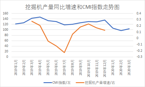 對(duì)比挖掘機(jī)產(chǎn)量各月同比增速和CMI走勢(shì)來看,挖掘機(jī)產(chǎn)量同比增速和CMI指數(shù)走勢(shì)基本保持一致。2020年3月CMI指數(shù)環(huán)比有所回升,預(yù)計(jì)2020年3月挖掘機(jī)產(chǎn)量同比增速也將有所提高。